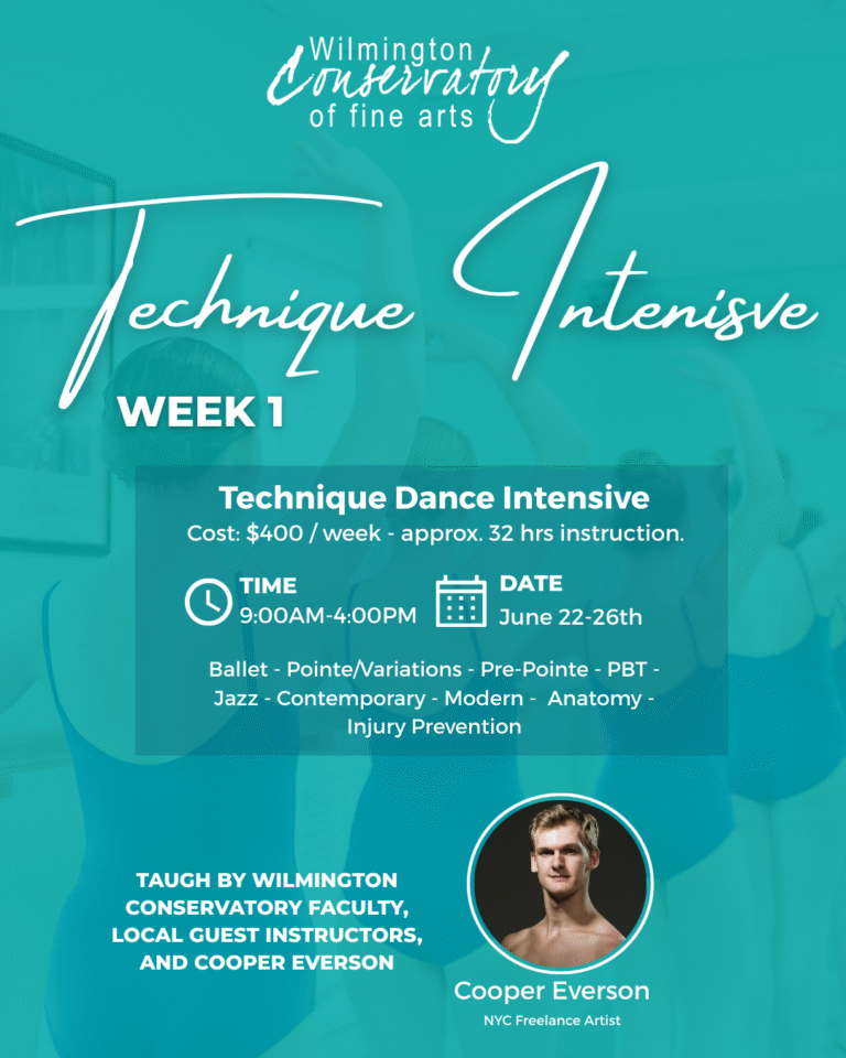 Technique Weeks are recommended for dancers seeking steady, challenging summer training, classical technical refinement, and readiness for the upcoming semester or future goals. Technique Intensive Weeks are open to advanced dancers across the Wilmington community, whether or not they plan to join WCFA for the upcoming school year. Intensives are geared for ages 9+ with at least 1 1/2 – 2 years of dance experience. Placement classes will take place on the first day of classes each week.